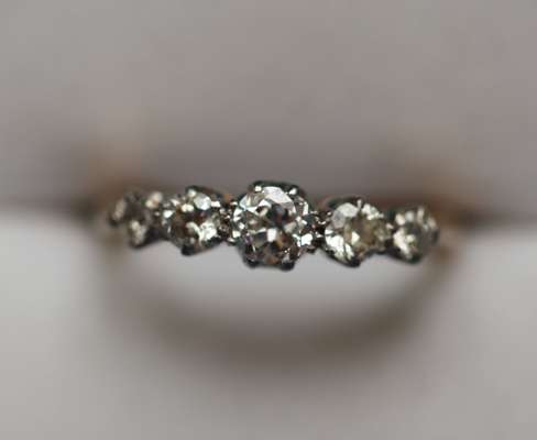 claw set with five graduated old cut diamonds, to a yellow metal shank stamped 18CT PLAT
