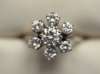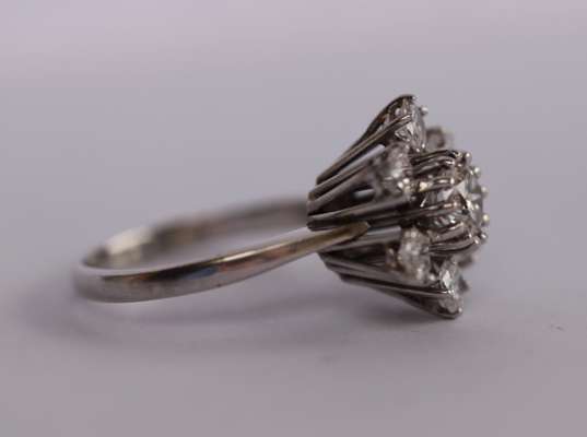 claw set with a round brilliant cut diamond in a border of six smaller diamonds, in a raised white metal setting, marks indistinct