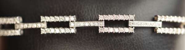 composed of rectangular links, millegrain set with round brilliant cut diamonds, each link joined by a similarly set bar, with spring clip fastening and safety chain, stamped 750