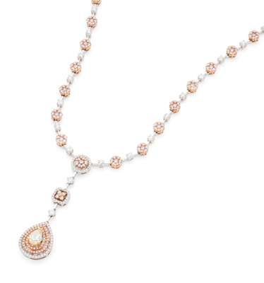composed of floral clusters, each claw set with seven round brilliant cut fancy pink diamonds, conjoined by knife bars and interspersed by similarly cut colourless diamonds, with open circular border, also set with colourless round brilliant cut diamonds, around the central fancy pink diamond set floral cluster, suspending a detachable drop comprising a similarly set square cluster and a larger ovoid cluster, claw set to the centre with a pear cut yellow diamond within outer borders of fancy pink and yellow round brilliant cut diamonds, three-coloured precious metal setting stamped 750