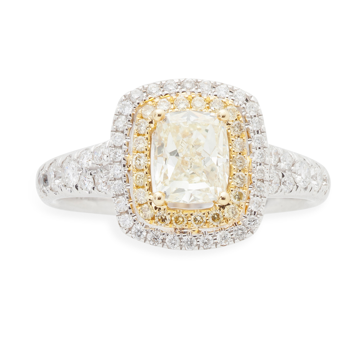 the central corner claw set cushion cut fancy light yellow diamond within a rounded rectangular border, millegrain set with round brilliant cut fancy yellow diamonds and a similar outer border of colourless diamonds, flanked by split shoulders also set with graduated colourless diamonds, shank stamped 750