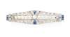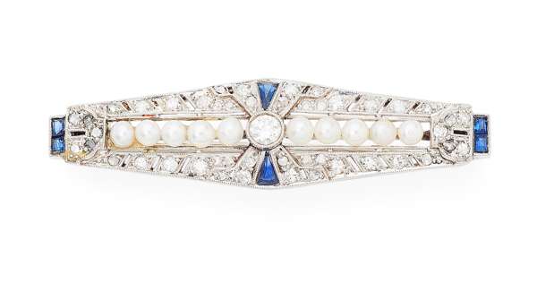 millegrain set to the centre with a round cut diamond in a row of ten seed pearls, in a stylised surround of round cut diamonds and mixed cut sapphires, with brooch fittings