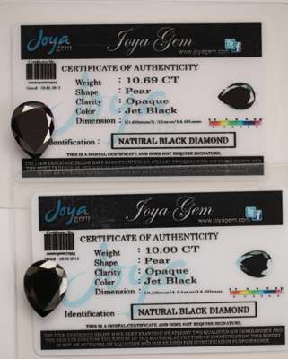 each contained in a display box, with accompanying Joya Gem Certificate of Authenticity, dated 19.05.12, stating weights: 10.00cts and 10.69cts (2)