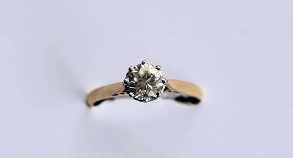 claw set in white gold with a circular brilliant cut diamond, pierced gallery with raised shoulders, yellow gold shank