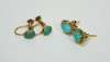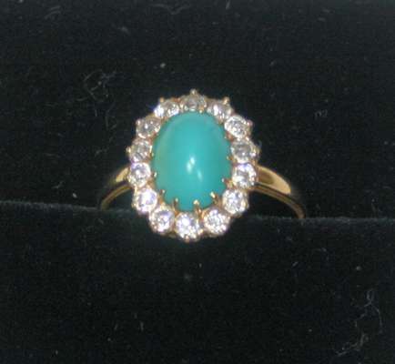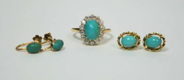 the central oval turquoise cabochon claw set in a border of old cut diamonds, to a yellow metal shank stamped 750; together with a pair of turquoise set ear studs, the central oval turquoise cabochon claw set in an open yellow metal border, with post and butterfly fittings, stamped 14K; another pair of turquoise set ear rings (3)