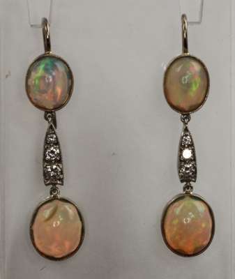 each composed of a millegrain collet set oval cut opal cabochon, surmounting a line of three graduated round brilliant cut diamonds, suspending a larger oval cut opal cabochon drop, with wire fittings