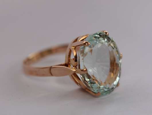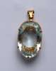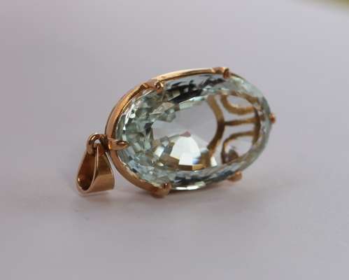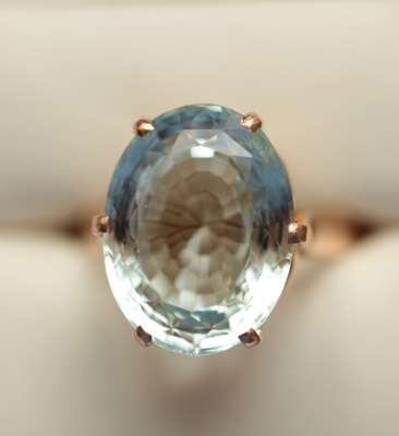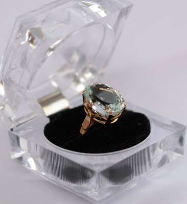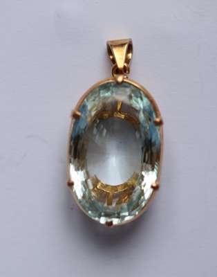 the oval shaped aquamarine claw set in yellow metal with a decorative pierced gallery, to a 9ct gold belcher link chain; together with a matching ring, shank unmarked (2)