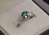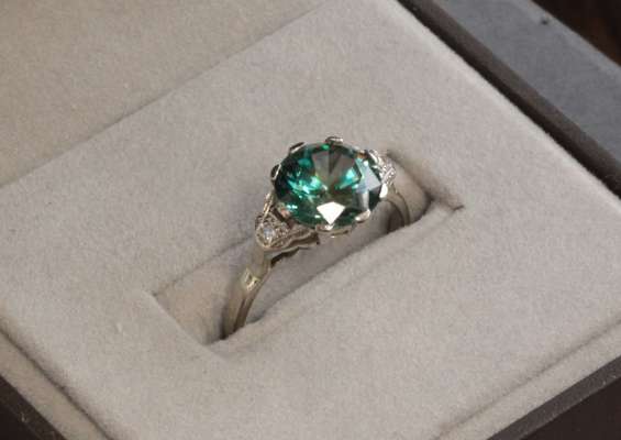 the central claw set circular cut blue zircon, flanked to either side by an illusion set single cut diamond