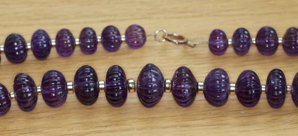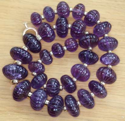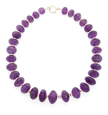 composed of large graduated melon ball carved beads, ranging from approximately 16.6mm to 30mm diameter, interspersed by small plain cylindrical gold coloured beads, with large hinged circular clasp