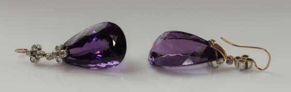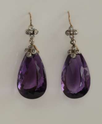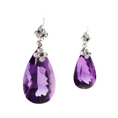 each composed of a large pear cut deep purple amethyst, surmounted by two quatrefoil shaped clusters millegrain collet set with old European cut diamonds, with wire fittings