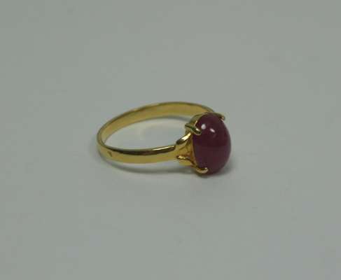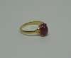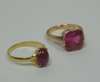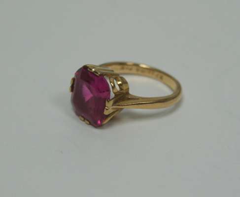 the square cut tourmaline corner claw set in yellow metal, (indistinct marks; together with a single stone ruby ring, claw set in yellow metal with a cabochon ruby (2)