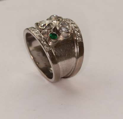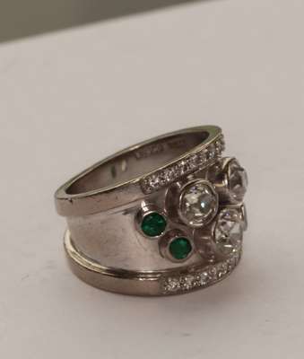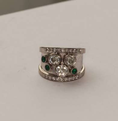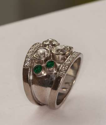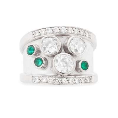 the thick white metal band collet set with three offset old cut diamonds and three similarly set round cut emeralds, in a border of claw set round cut diamonds