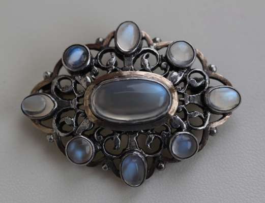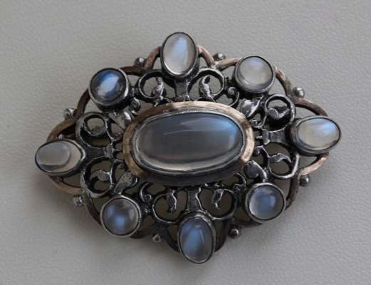 SYBIL DUNLOP - a silver mounted moonstone set brooch