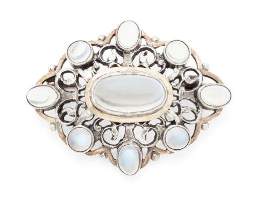 of pierced shaped oval form, with central collet set oval cut moonstone cabochon, within a scrolling border alternately collet set with circular and oval cut moonstone cabochons, with hinged pin fitting