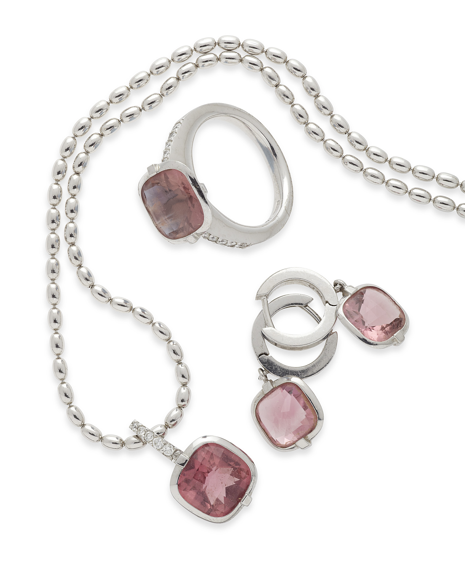 comprising a pair of pendant earrings, a pendant with chain and a ring, each collet set with a fancy cushion shaped rose cut pink tourmaline, the earrings of hinged hooped design, the pendant with round brilliant cut diamond set bale, suspended from a fancy oval link chain, the ring additionally set to the shoulders with round brilliant cut diamonds, contained in a cream suede pochette and WEMPE box