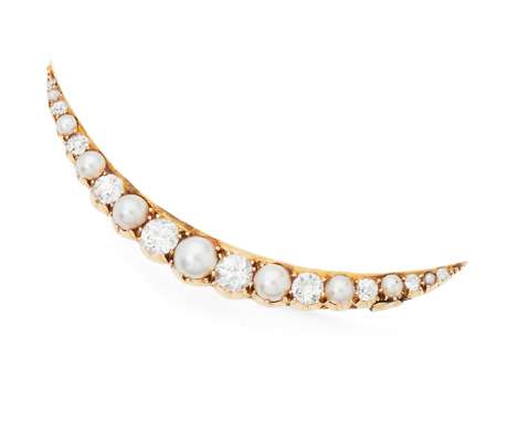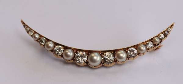 A pearl and diamond set crescent brooch
