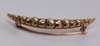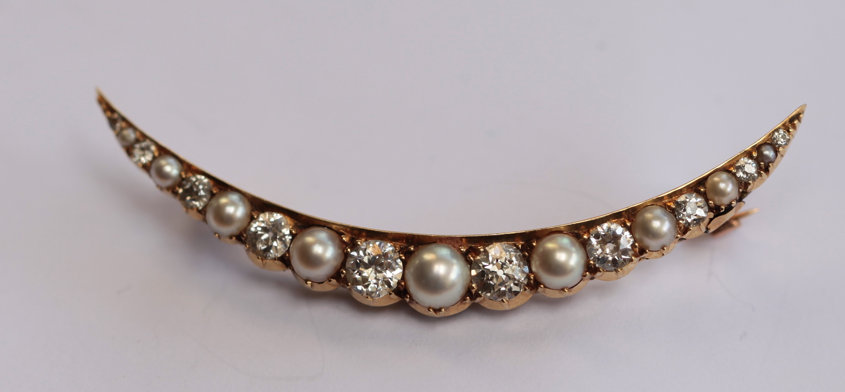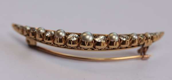 claw set to the front in yellow metal with alternating old cut diamonds and pearls, with brooch fitting