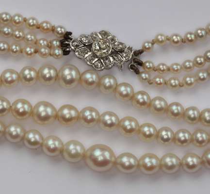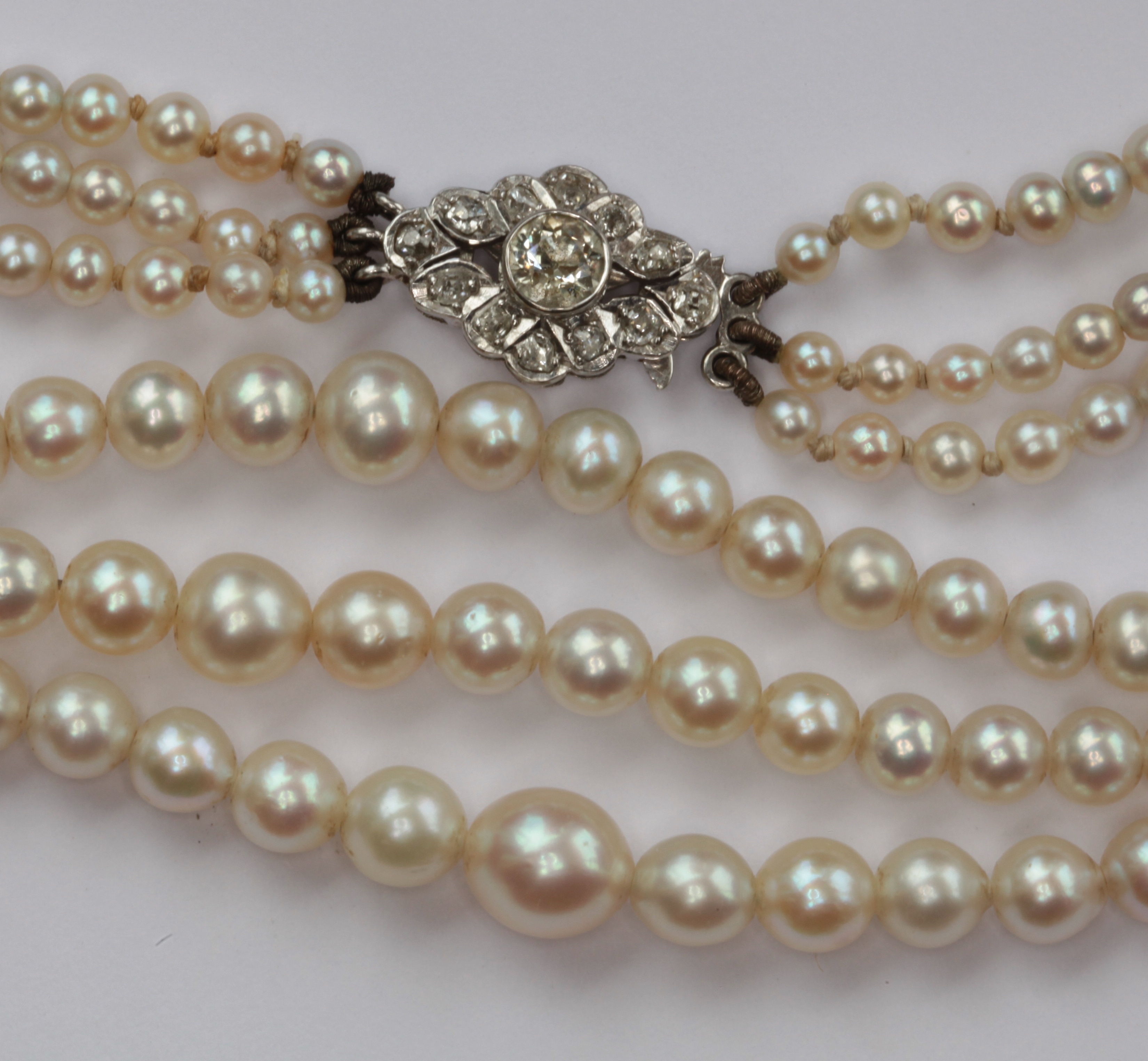 the necklace composed of three-rows of graduated cultured pearls, ranging from approximately 3.2mm to 7.4mm diameter, with pierced shaped oval clasp, collet set to the centre with a round brilliant cut diamond within a border of smaller old mine cut diamonds