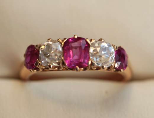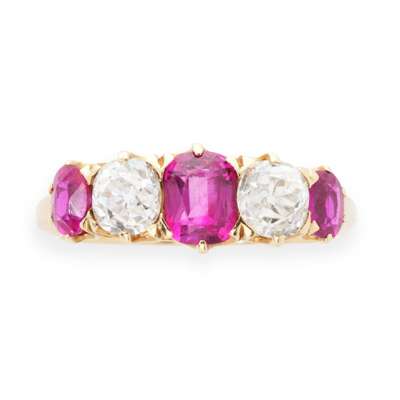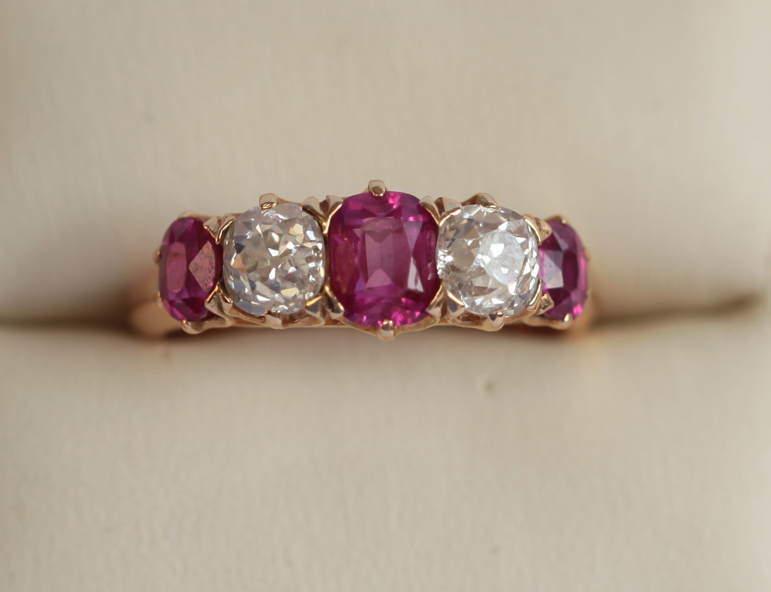 alternately claw set with three oval cut rubies and two old cut diamonds, to an unmarked yellow metal shank