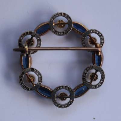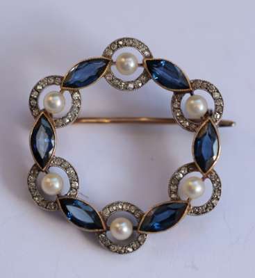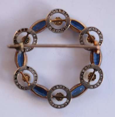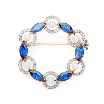 of circular design, alternately set with six marquise cut sapphires and six seed pearls, each pearl in an open circular border of small old cut diamonds, control mark to pin and catch