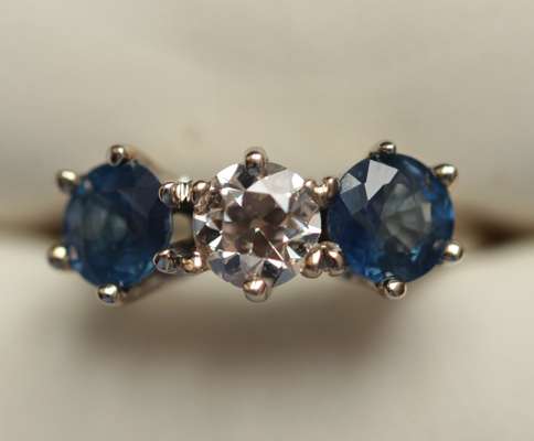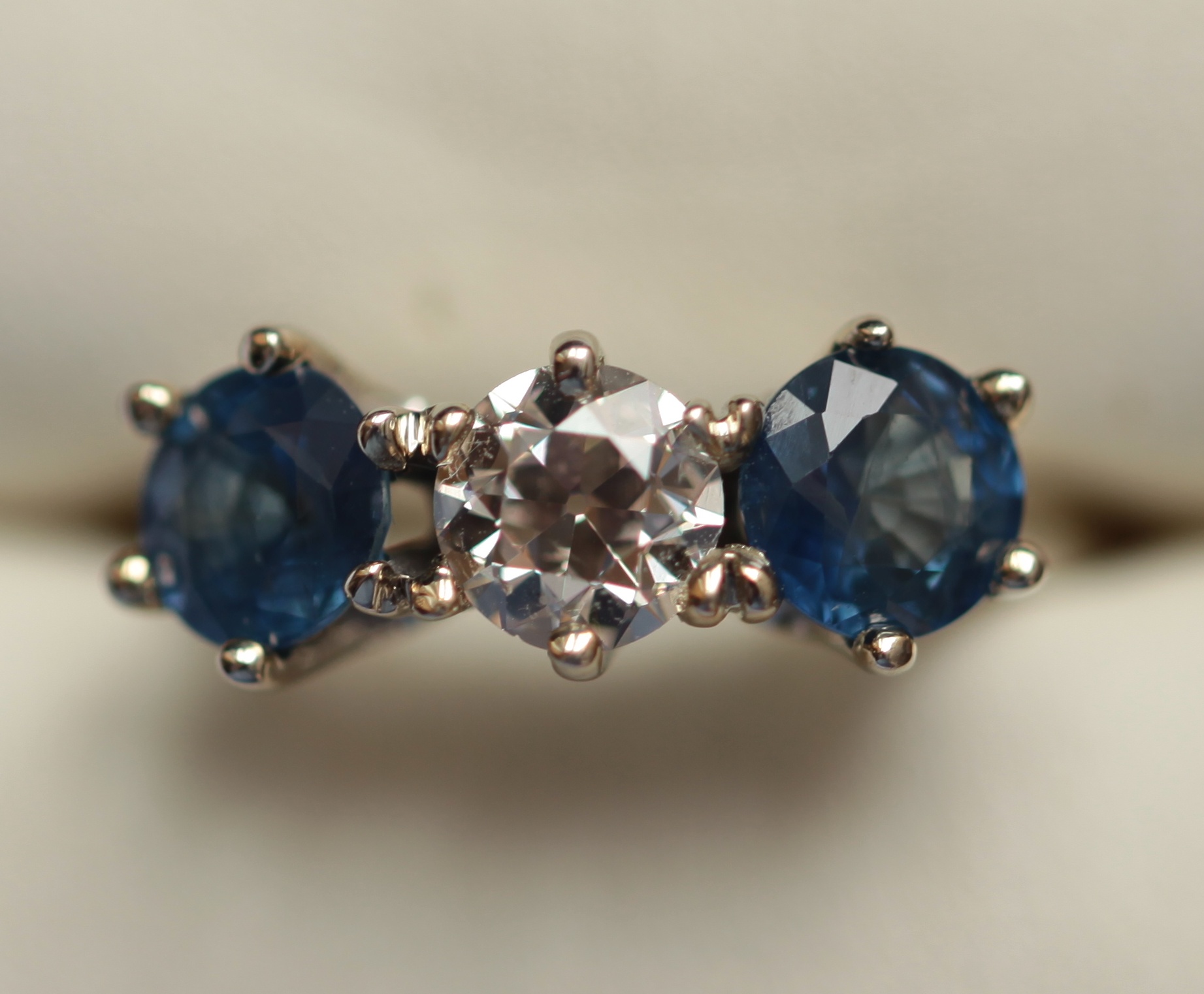 the central claw set round brilliant cut diamond flanked to either side by a circular cut sapphire, mount stamped 14K