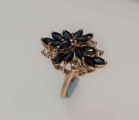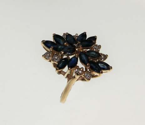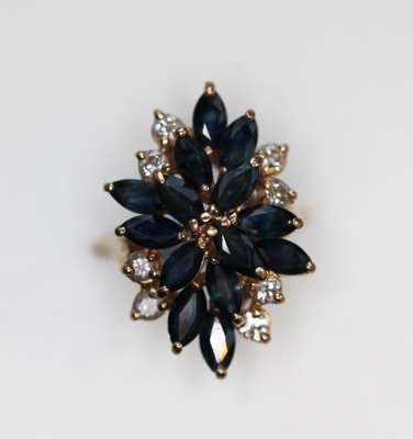of slight assymetric design, with a cross design of spreading navette cut sapphires and a pair of circular brilliant cut diamonds between each arm, all set in yellow metal and marked 14K