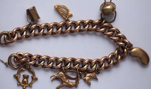 composed of curb links with padlock fastening, featuring an assortment of eight charms