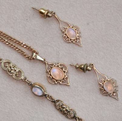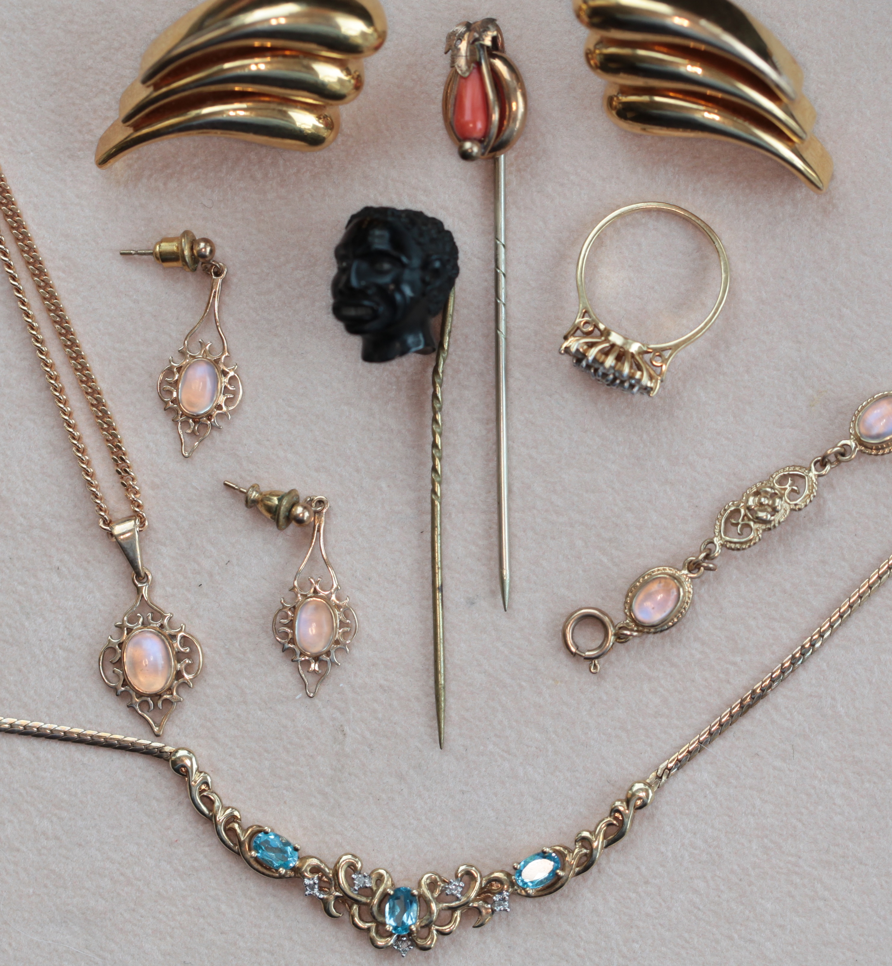 set small circular and princess cut diamonds; a pair of 18ct gold earrings of lobed form; a coral set tiepin; another as a Negro's head; a moonstone and 9ct gold modern set of pendant errings, pendant necklace, and bracelet; another gem set fringe necklace and a small diamond cluster ring (Qty)