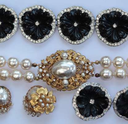 to include a black plastic and paste set necklace, composed of twelve black flower heads in a border of round cut pastes; with a pair of matching ear clips; together with a paste pearl choker, composed of a double row of paste pearls, set to the centre with a pierced yellow metal panel of foliate design set with paste pearls other clear pastes; with associated earclips (4)