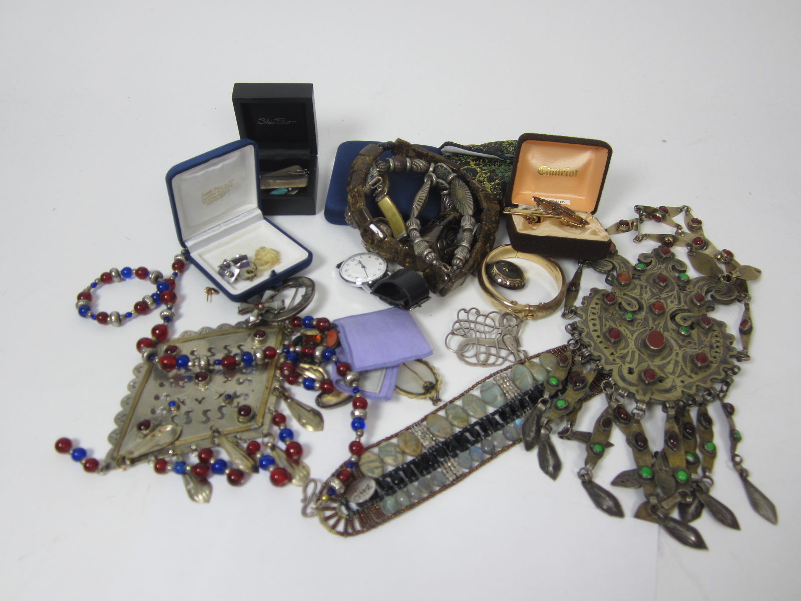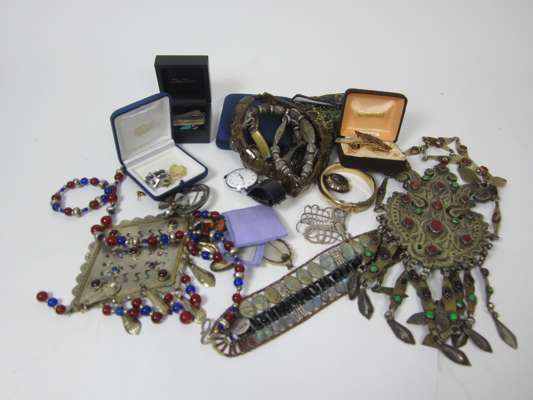 to include two ethic white metal and bead set necklaces; two scottish hardstone brooches; a yellow metal bangle stamped 9ct; a gentleman's Sekonda wriist watch; three bar brooches; and various other necklaces, earrings and brooches (qty)
