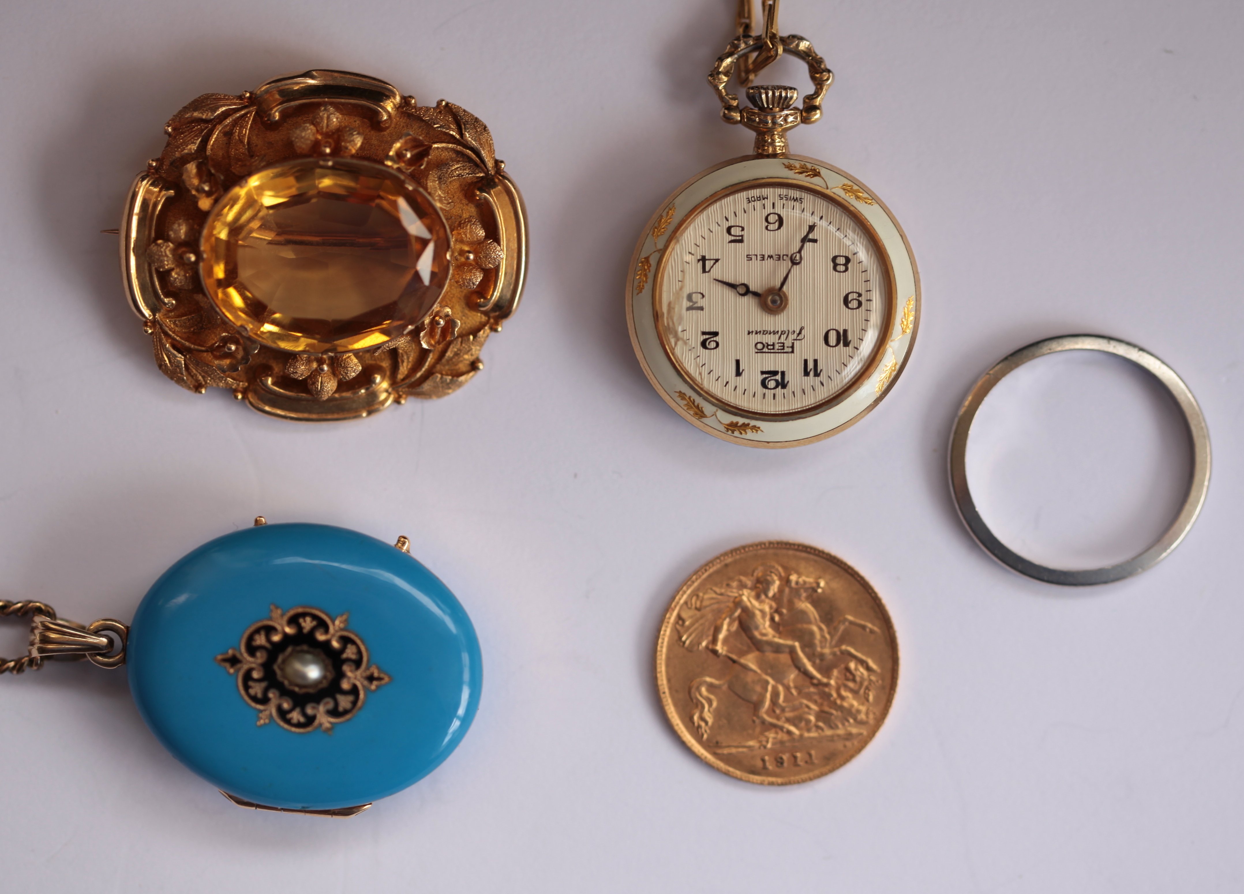the back and front enamelled with seed pearl detail to centre front, to a yellow metal curb link chain; together with a yellow metal citrine set brooch, the oval cut claw set citrine in a decorative foliate border, setting unmarked; a platinum wedding band; a half sovereign; an enamelled fob watch to a fancy link chain (5)