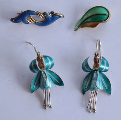 to include various Danish and other enamel brooches of foliate and abstract design, a necklace composed of blue enamel leaf panels, a pair of enamel and white metal earrings modelled as fuchsia, an enamel and white metal bracelet with foliate detail to each panel (qty)