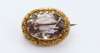 claw set to the centre with an oval cut amethyst, within a foliate scroll engraved border; together with a carved jadeite brooch of pale green rounded rectangular form, carved with a stylised bird, fruit and flowering foliage; a pearl and turquoise pendant of circular form with spray decoration, gold neck chain and a Victorian gold framed shell cameo brooch with plain frame; together with a 9ct gold and moonstone necklace, the spectacle set oval cabochons (qty)