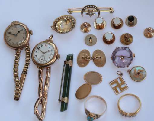 two ladies gold wrist watches, a gold mounted nephrite bar brooch, a pair of 9ct gold cufflinks and various dress studs, an amethyst circular brooch with inset pearl, a seed pearl set bar brooch, a gold ring with three diamonds (two stones lacking), a turquoise set ring, a bar brooch set old mine cut diamonds to a central cluster and diamond set terminals, an oval citrine and seed pearl brooch, two swastika small pendants (Qty)