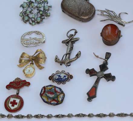a Scottish silver brooch, modern, marked Tain, Victorian silver anchor brooch, other brooches etc, sovereign case etc