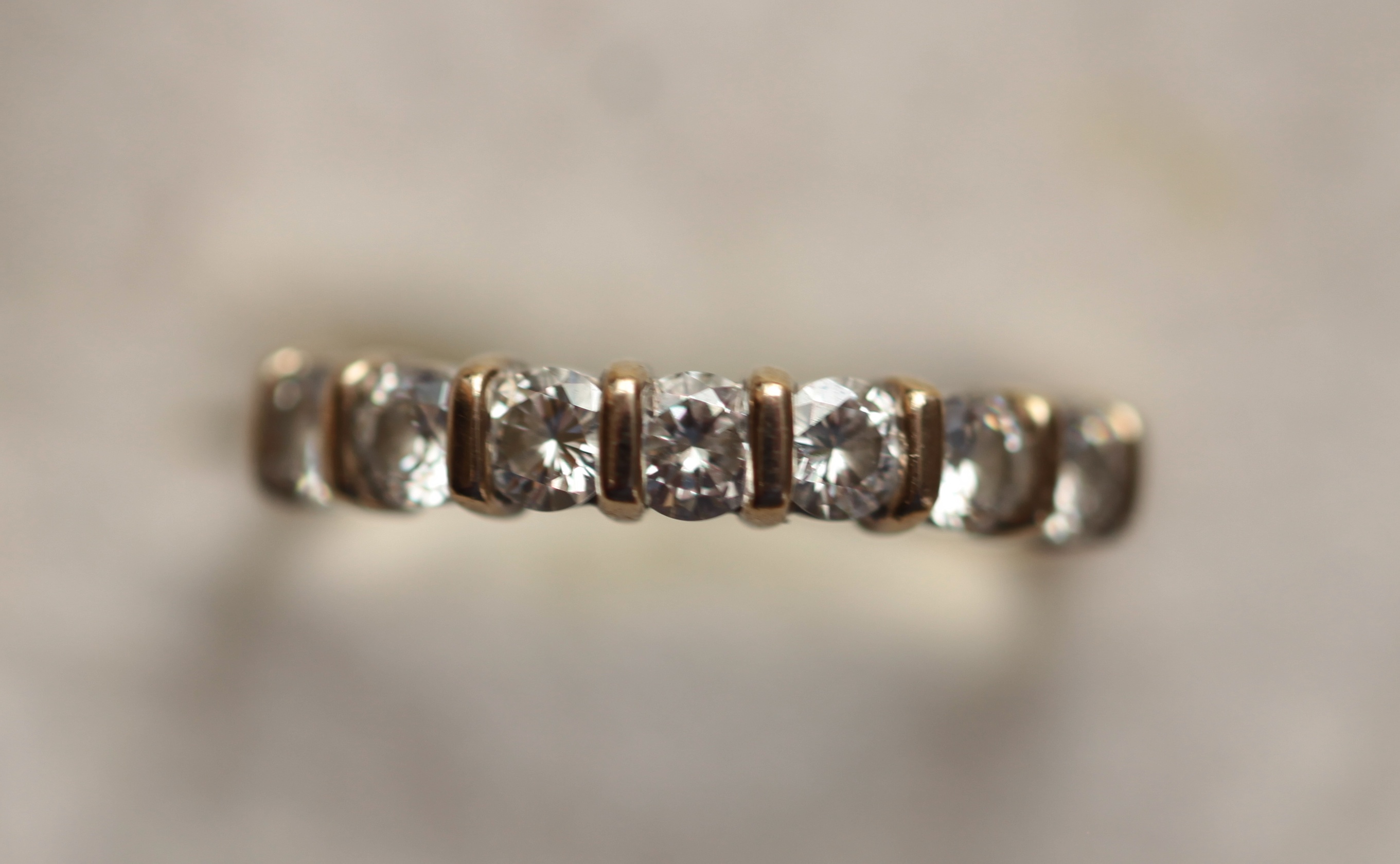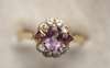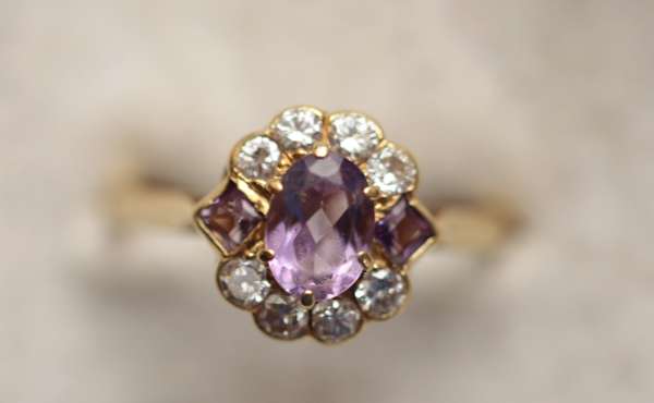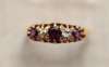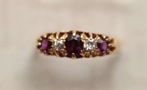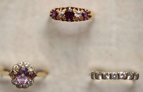 set with seven bar set round brilliant cut diamonds to an 18ct gold shank; together with a five stone ruby and diamond ring, alternately claw set with three oval shaped rubies and two old cut diamonds to an 18ct gold shank; an amethyst and diamond cluster ring, claw set to the centre with an oval shaped amethyst in a border of two table cut amethysts and eight old cut diamonds, to an 18ct gold shank (3)