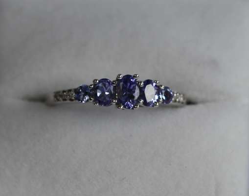 to include a 9ct white gold mounted Tanzanite five-stone ring, additionally set to each shoulder with three single cut diamonds; together with six other various gem set rings (7)