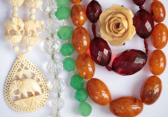 of a pleasing honey coloured hue; together with a carved ivory necklace, a carved ivory brooch modelled as a flower; various other paste necklaces (qty)