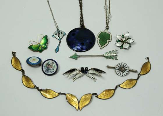to include a Norwegian yellow enamel necklace, composed of yellow metal leaf links; a David Andersen green enamel butterfly brooch; six enamel brooches of various designs, two further enamel necklaces and a further Norwegian necklace (qty)