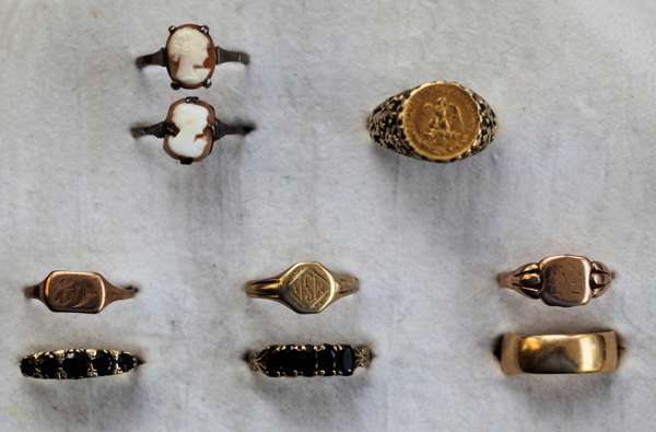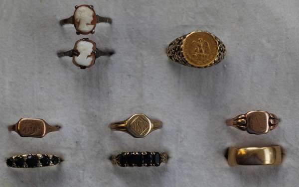 to include eight pairs of 9ct yellow gold earrings, of various designs; two Victorian seed pearl and gem set brooches, two sapphire set rings, and various 9ct, 18ct and cameo set rings (qty)