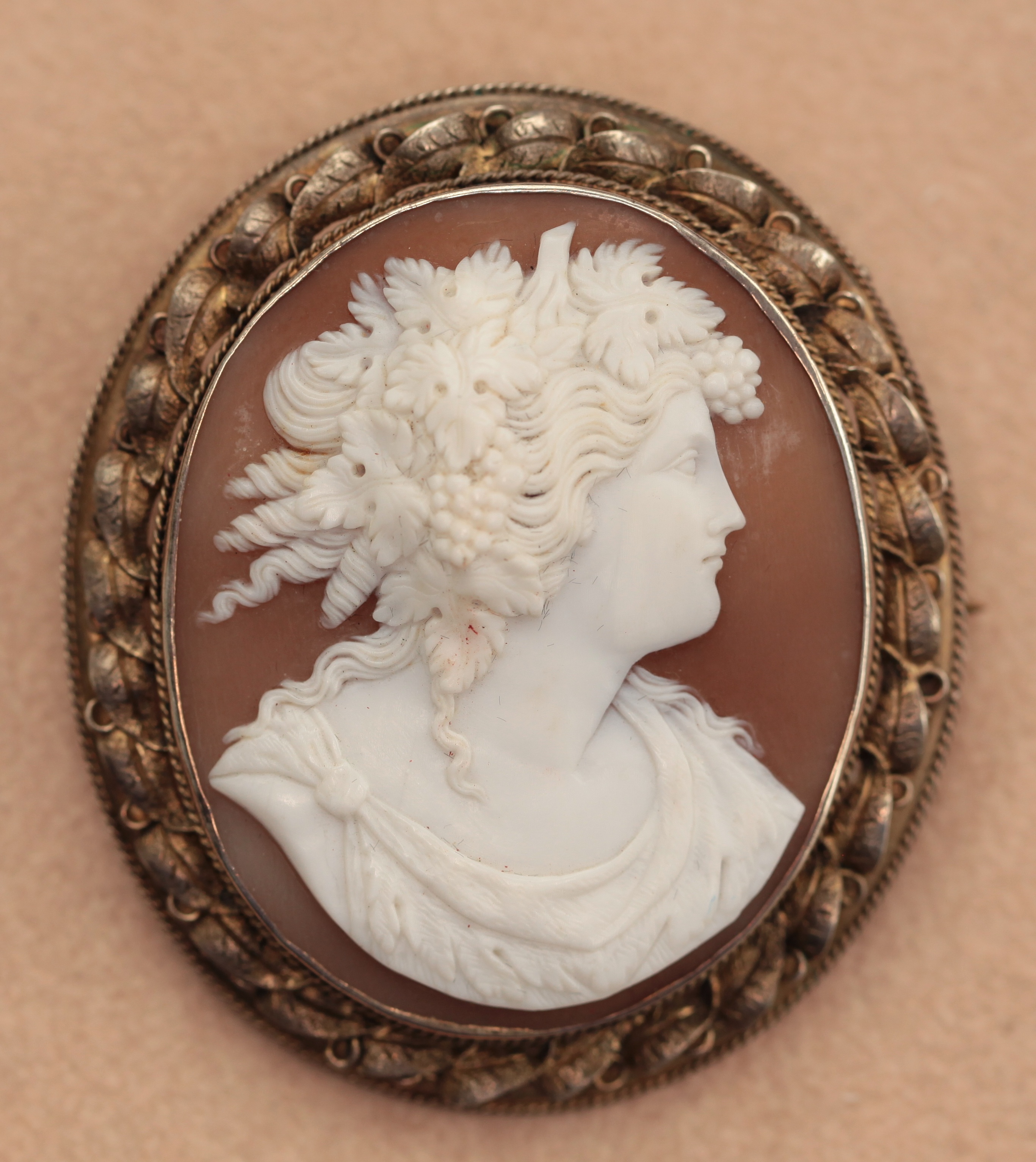 of a young lady depicting spring, gold frame; together with a modern shell cameo brooch (2)