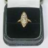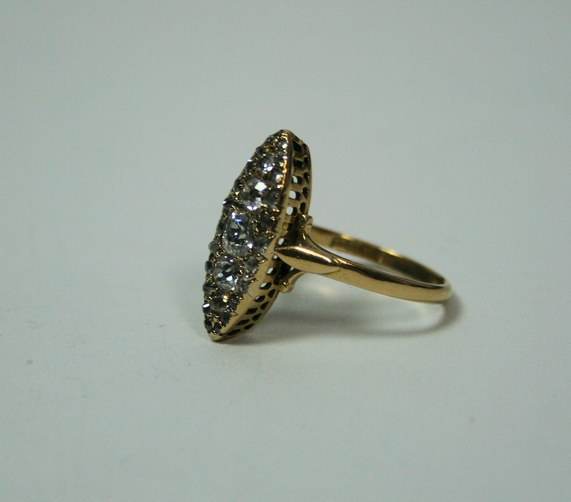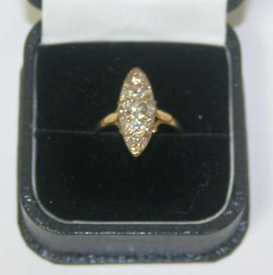 of navette shape, set with five graduated old mine cut diamonds within a border of mixed cut diamonds, to a plain yellow metal shank stamped 18CT