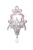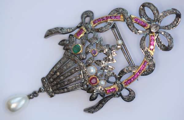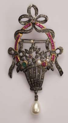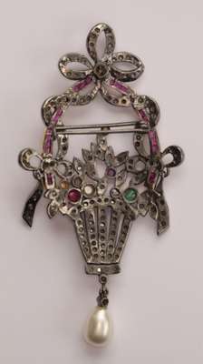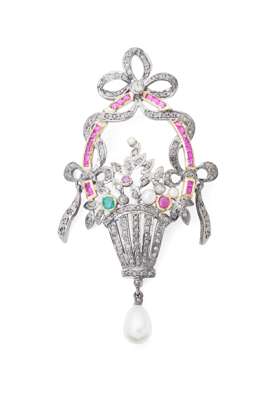 of tapering design, designed as a bow-tied ribbon surmounted basket, set throughout with graduated rose cut diamonds, calibre cut rubies (probably synthetic), a circular cut emerald, amethyst, ruby and seed pearls, suspending a large ovoid simulated pearl drop