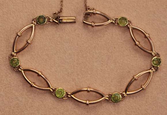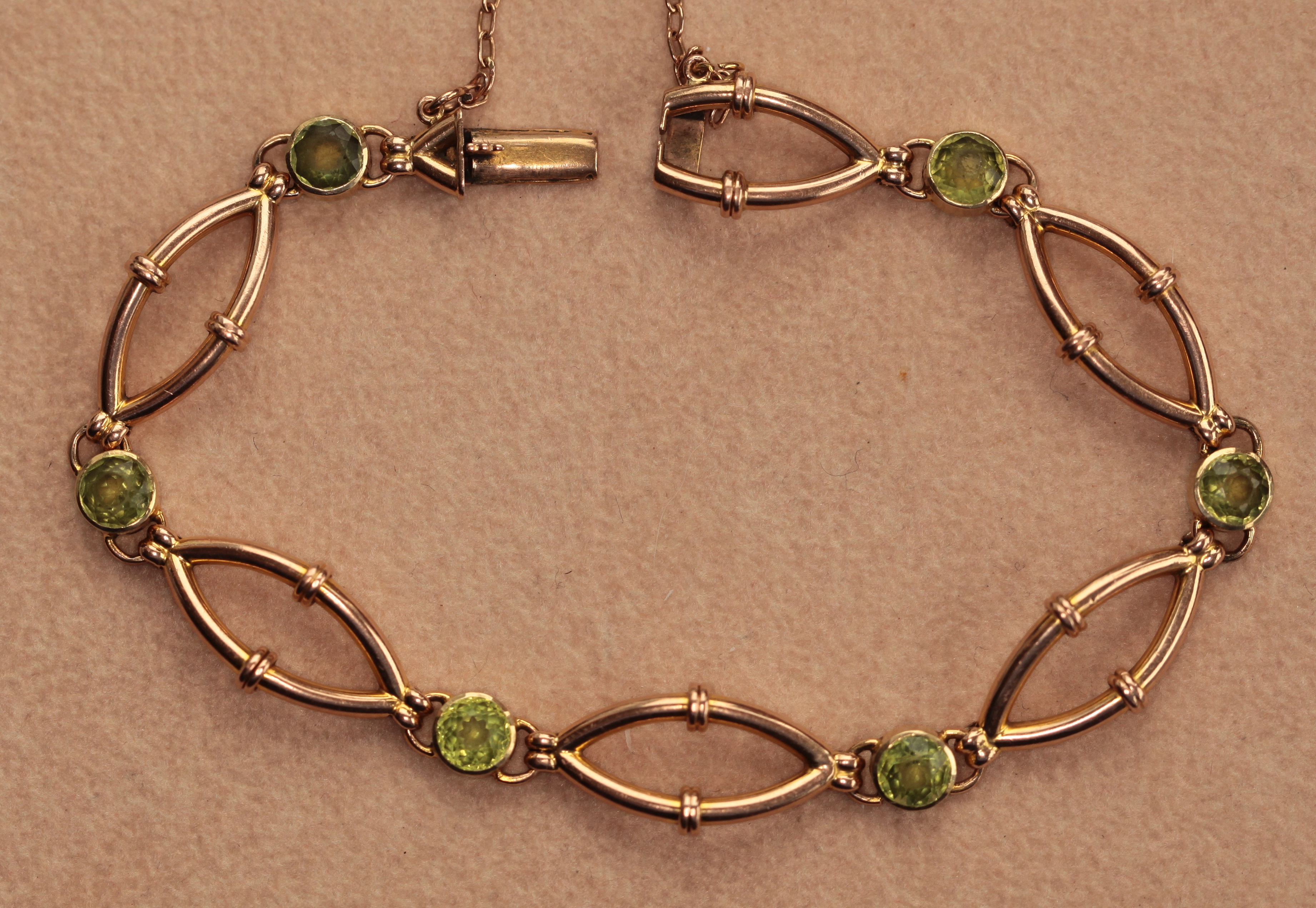 the collet set circular peridots spaced between open lozenge shaped links with reeded detail, with a conceal clasp and safety chain, stamped 15ct