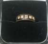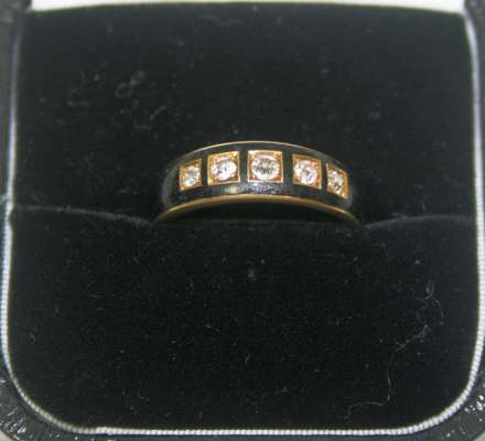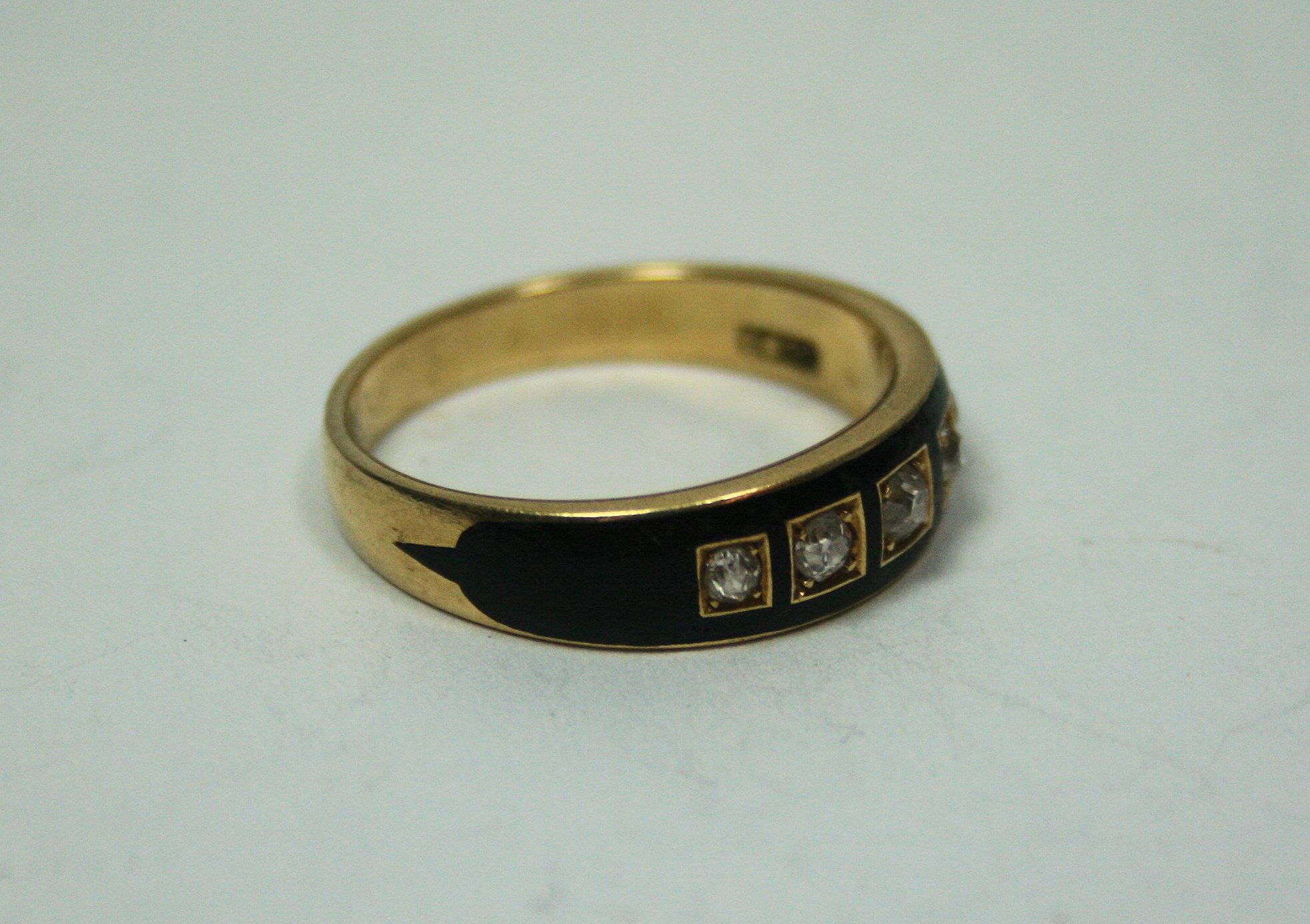 claw set with five graduated old cut stones in a black enamelled ground, to a yellow metal shank stamped 14CT