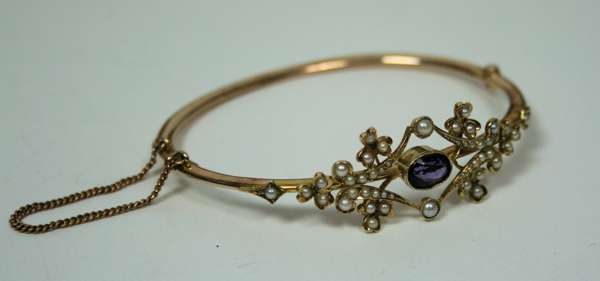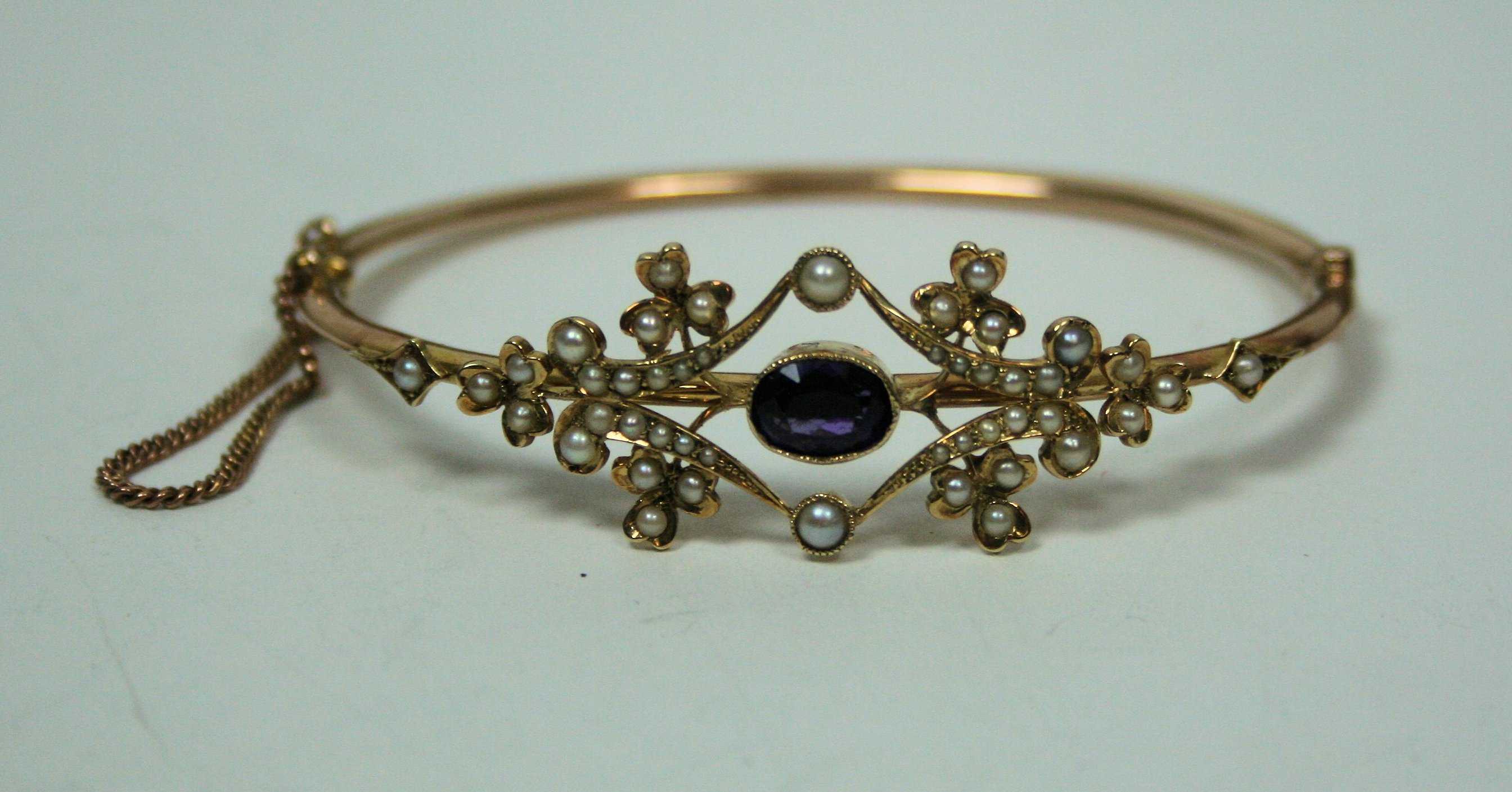of hinged design in yellow metal, collet set to the centre with an oval cut amethyst in a scrolling openwork border set with seed pearls, with concealed clasp and safety chain, stamped 15CT