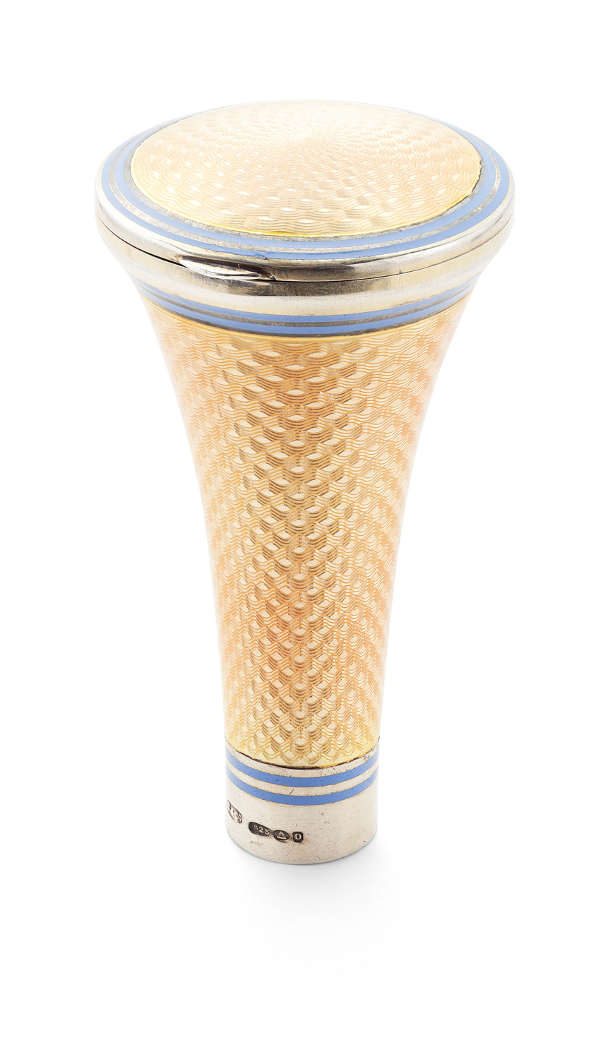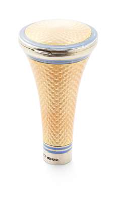 An early 20th century guilloche enamelled silver cane handle/compact