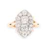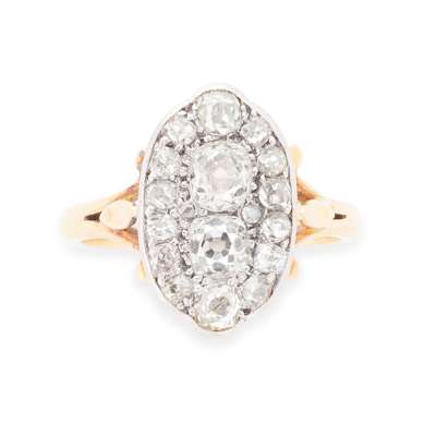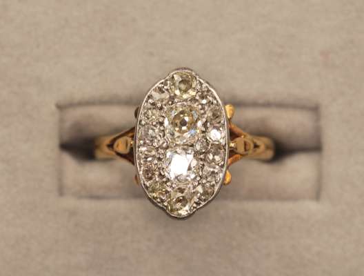 of oval shape, set with two larger old mine cut diamonds, one slightly cape, and border of old cut diamonds