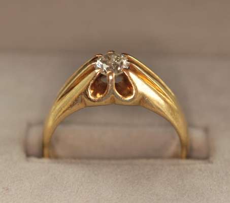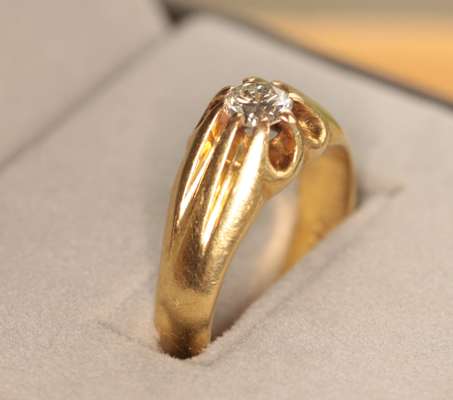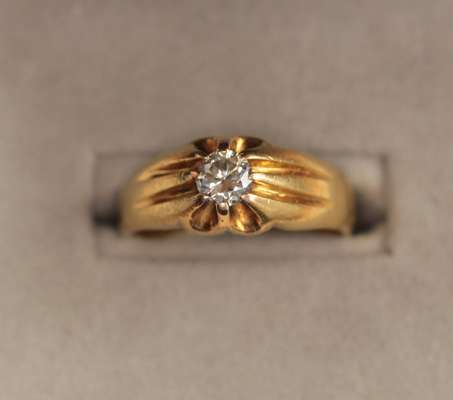 claw set with a circular brilliant cut diamond, reeded shoulders