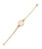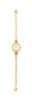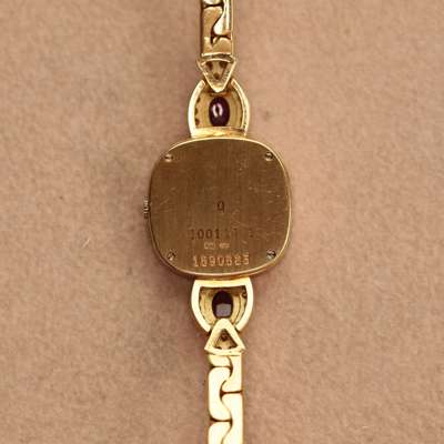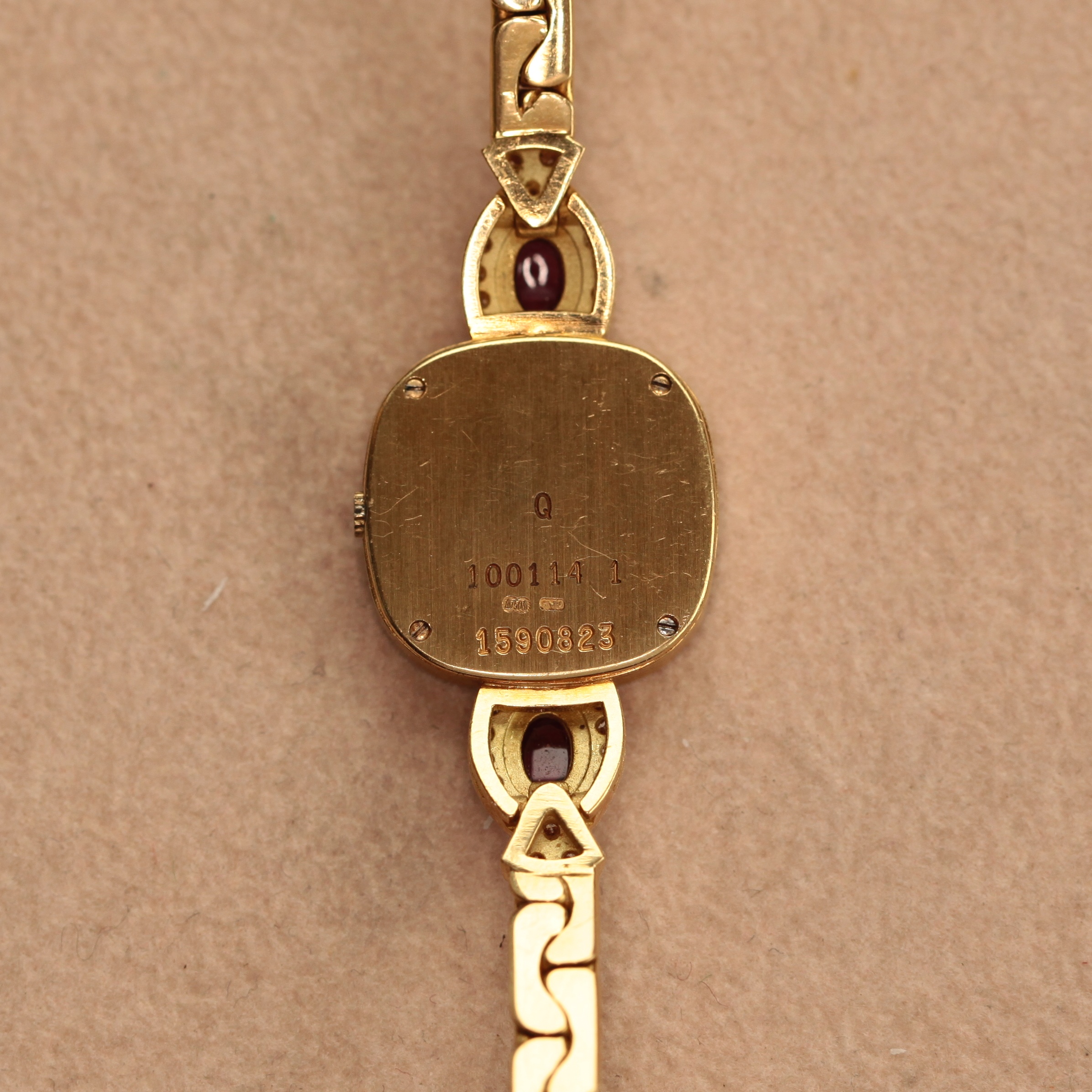 the gold rounded square dial with dot and baton numerals, with round brilliant cut diamond set bezel, the shoulders each collet set with an oval cut ruby cabochon
